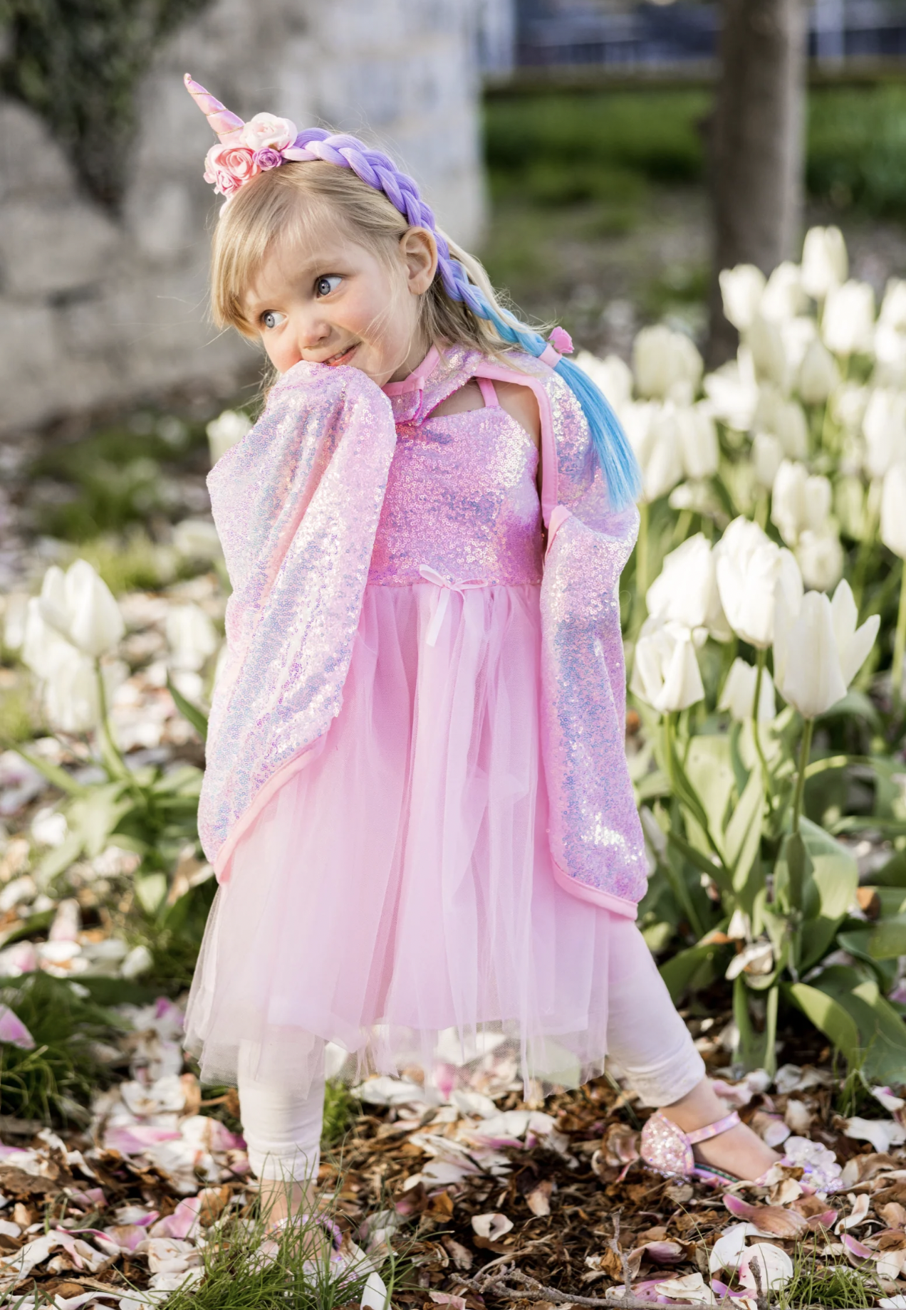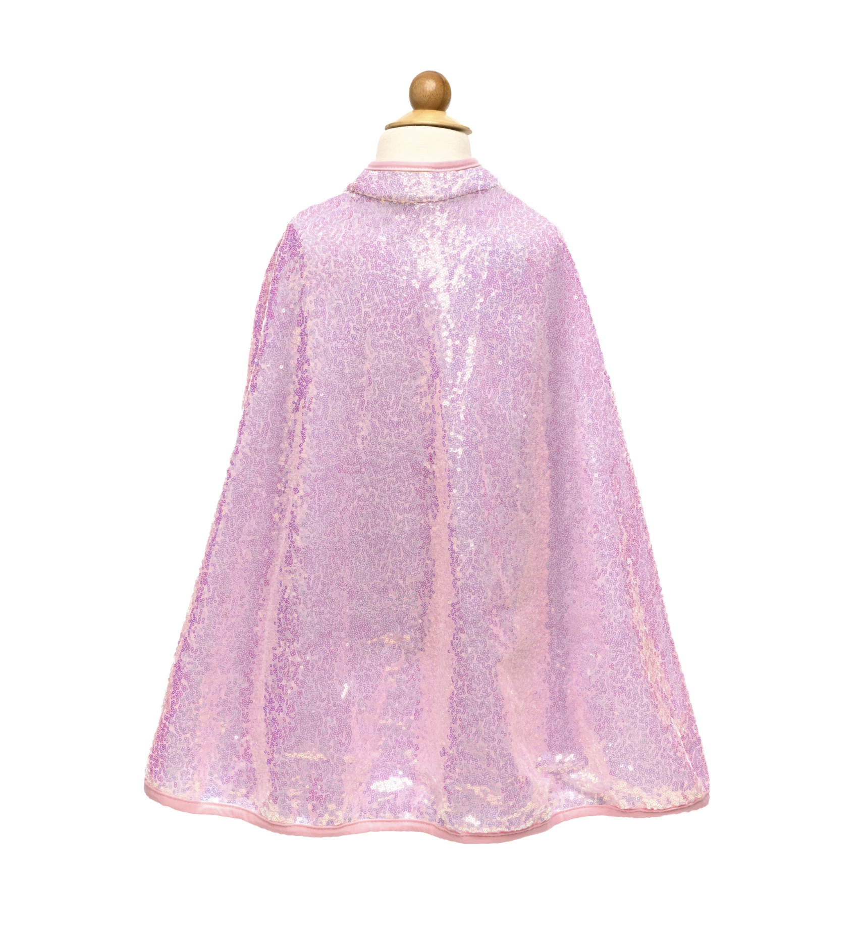 Capa repleta de lentejuelas lilas que brillan con cada giro, creando un efecto mágico y deslumbrante. Su cierre de velcro es práctico y ligera como una pluma, ideal para jugar.