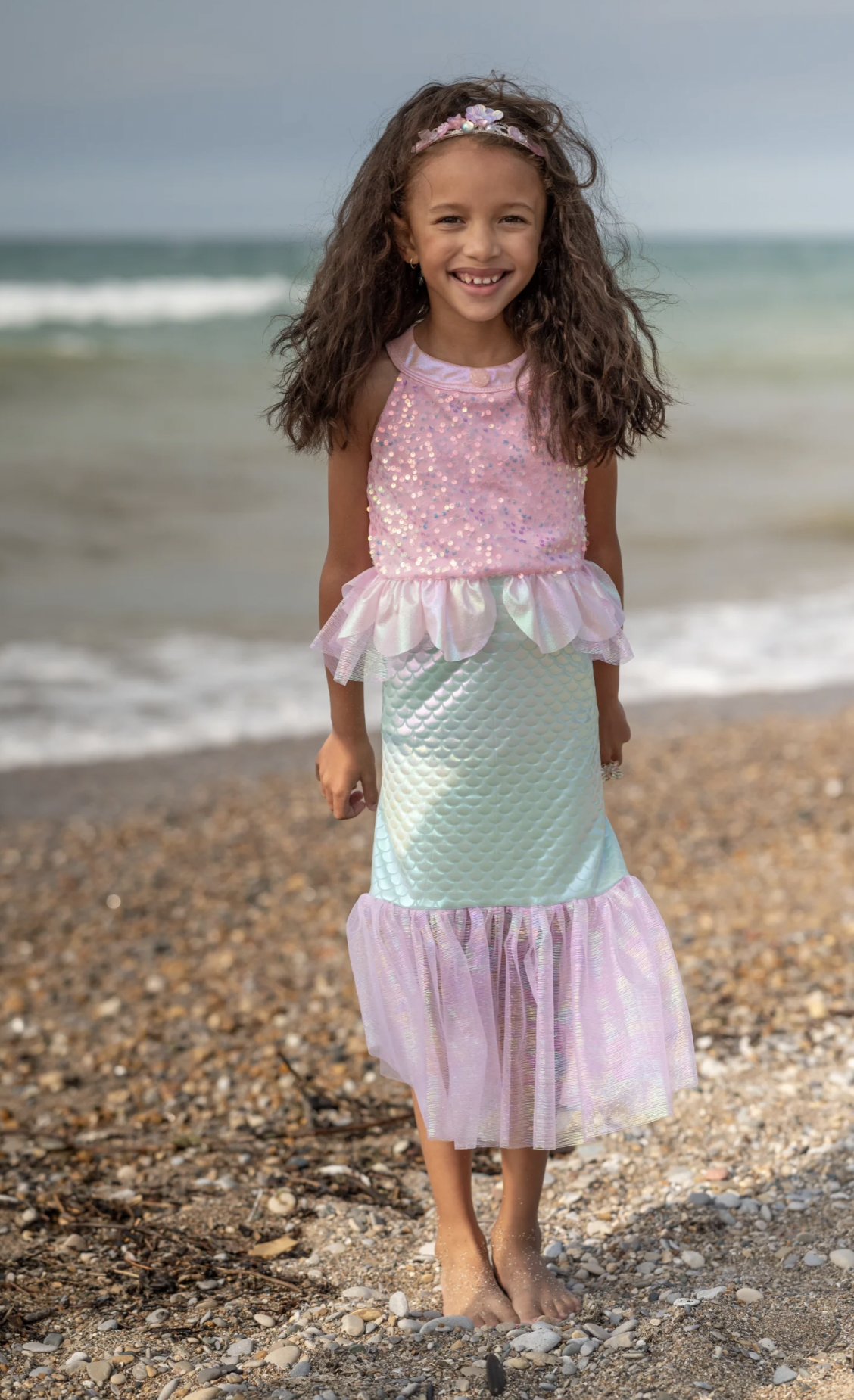 La cintura está adornada con un ribete estilo concha marina, que realza el encanto de la sirena y crea una transición perfecta hacia la impresionante falda verde azulado metálica que se encuentra debajo. El estampado de escamas vibrantes añade un toque de color y hace que su hijo se sienta como parte de un reino submarino.