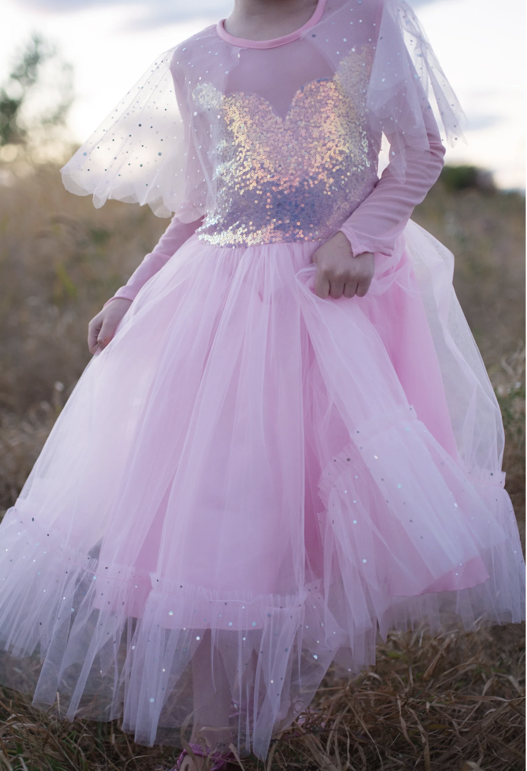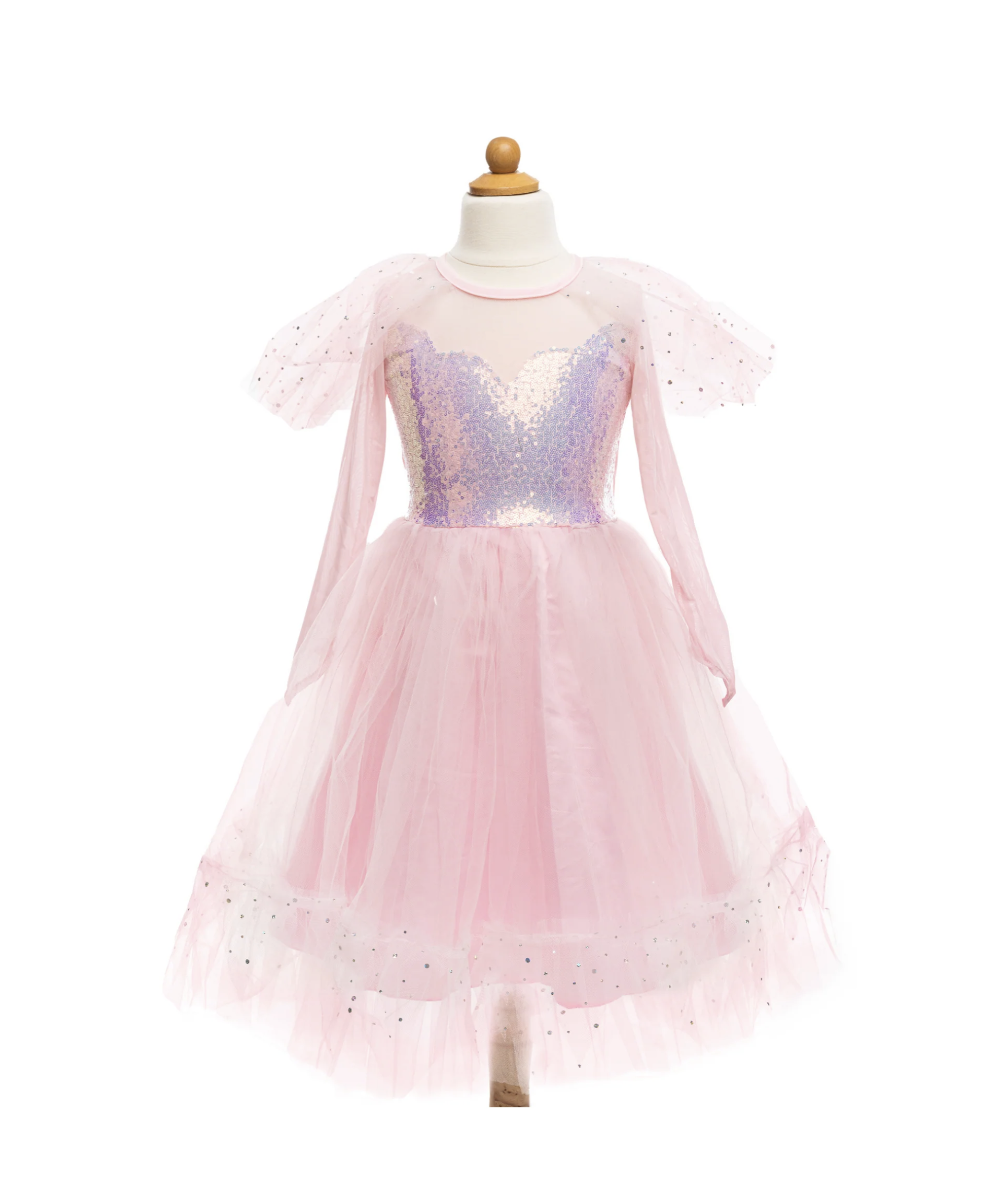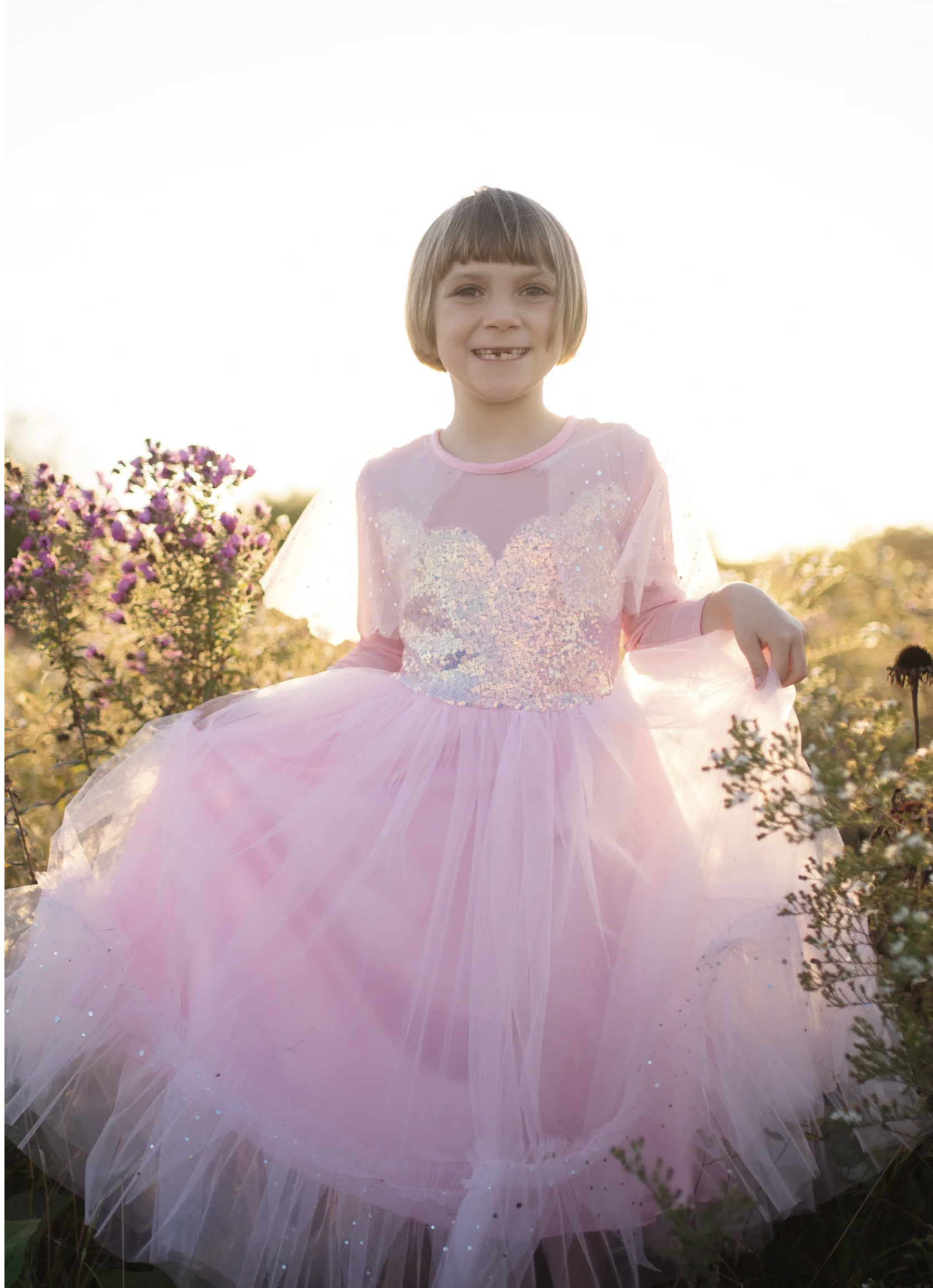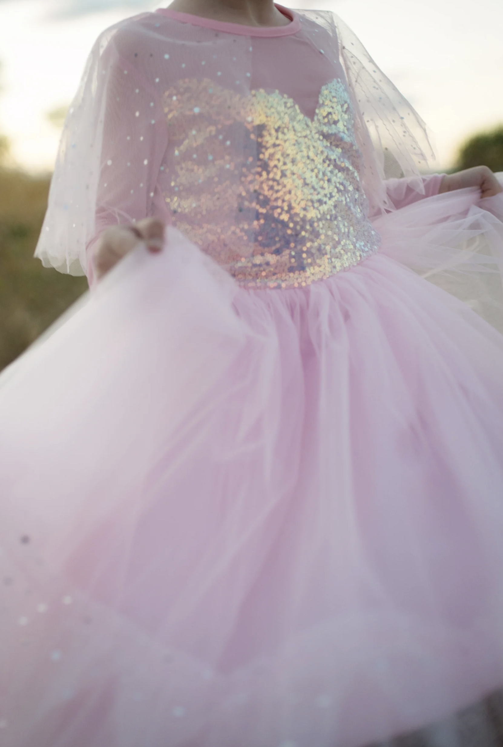 Con lentejuelas iridiscentes rosas y plateadas en el corpiño que se transforma en una hermosa falda rosa.