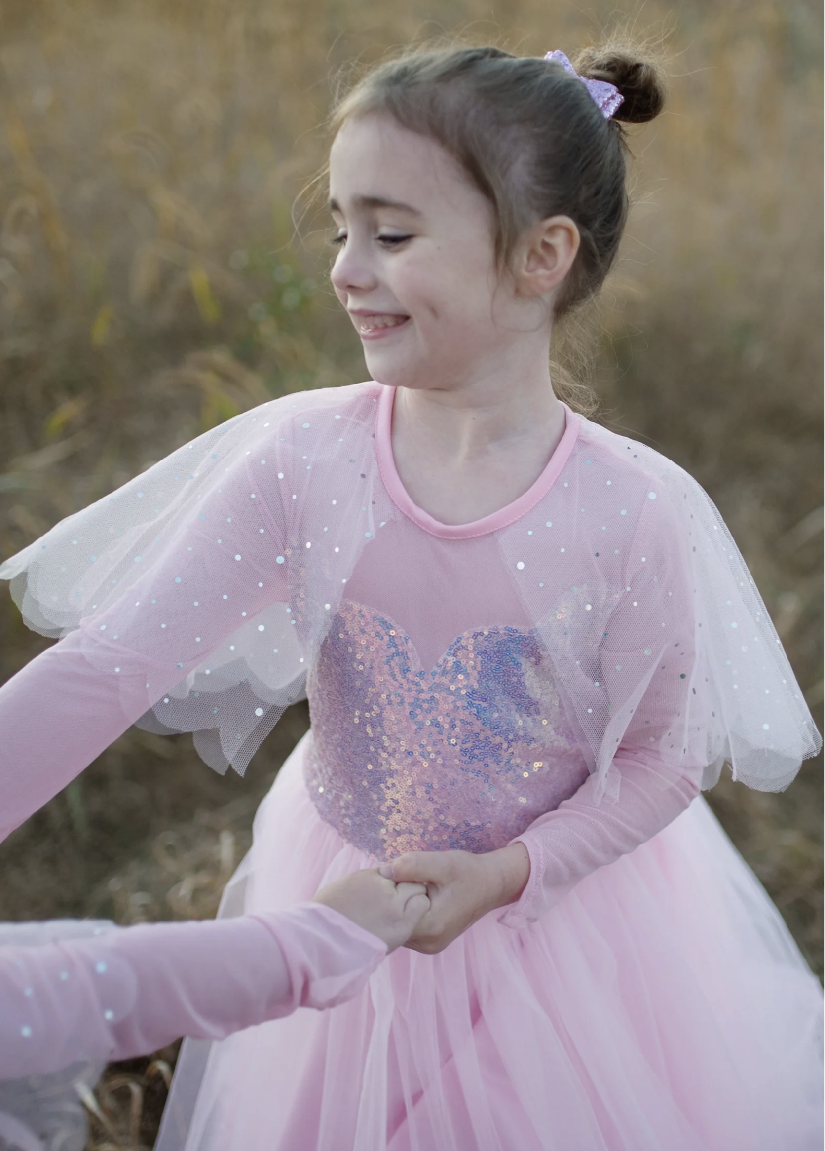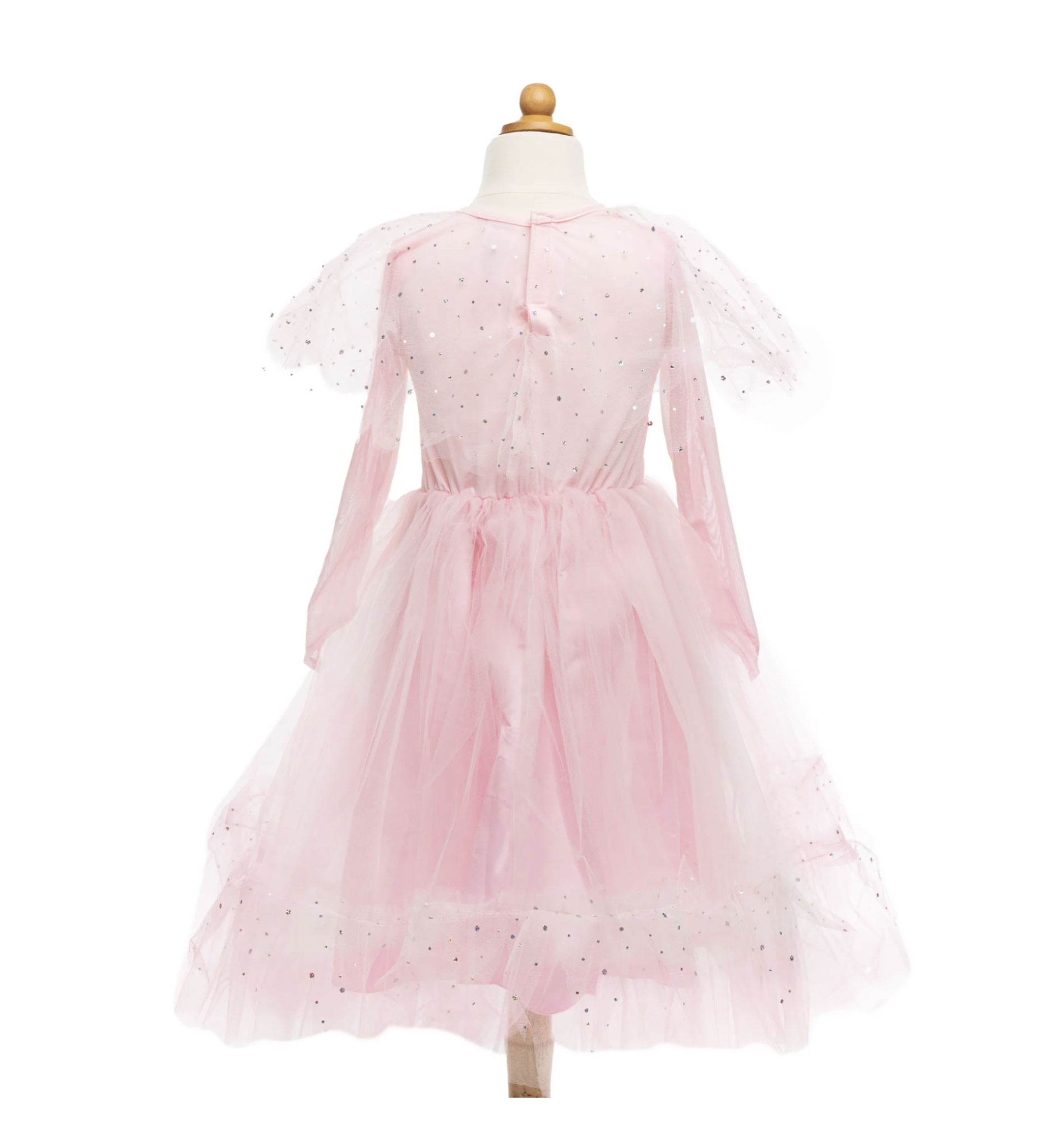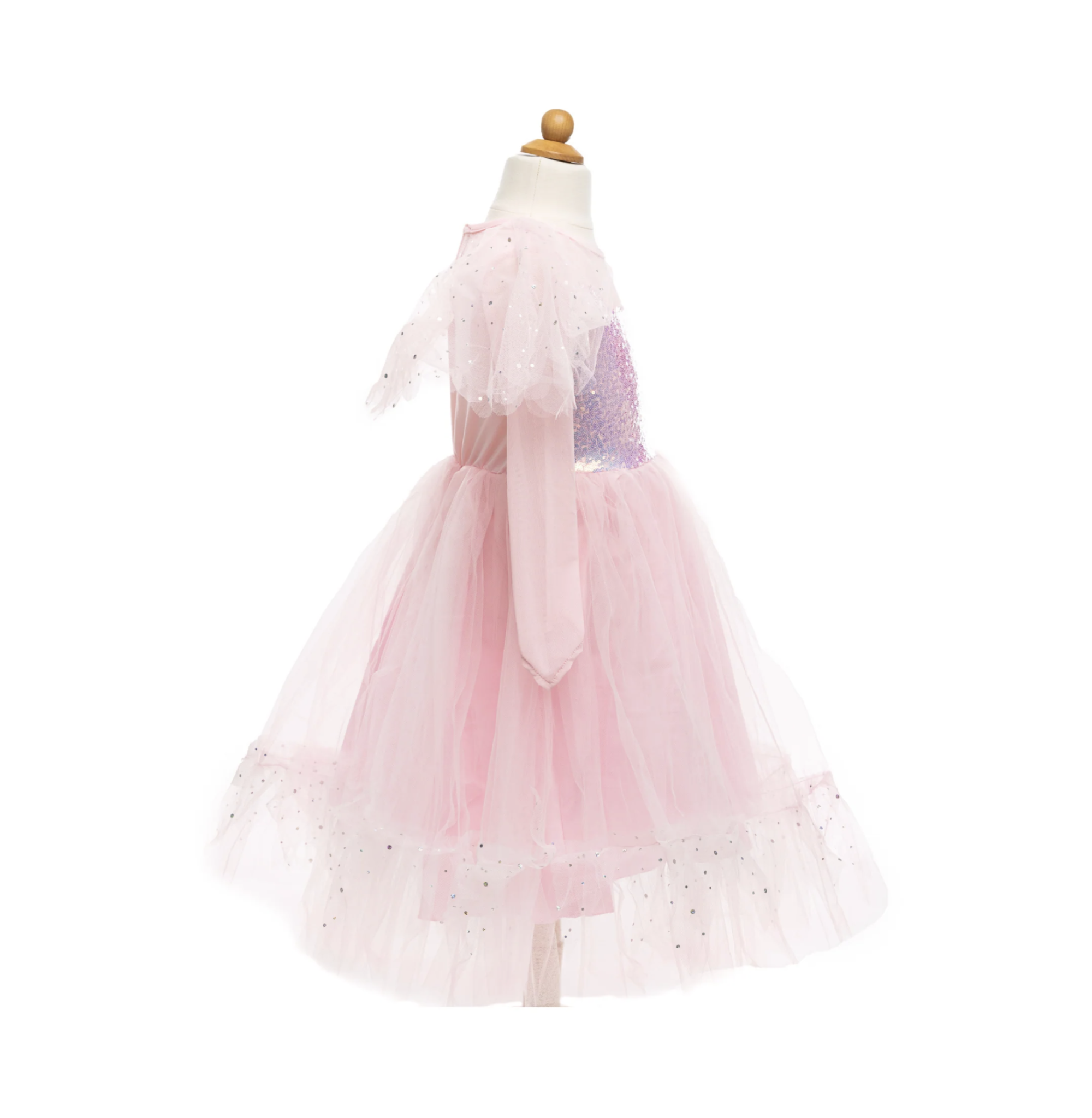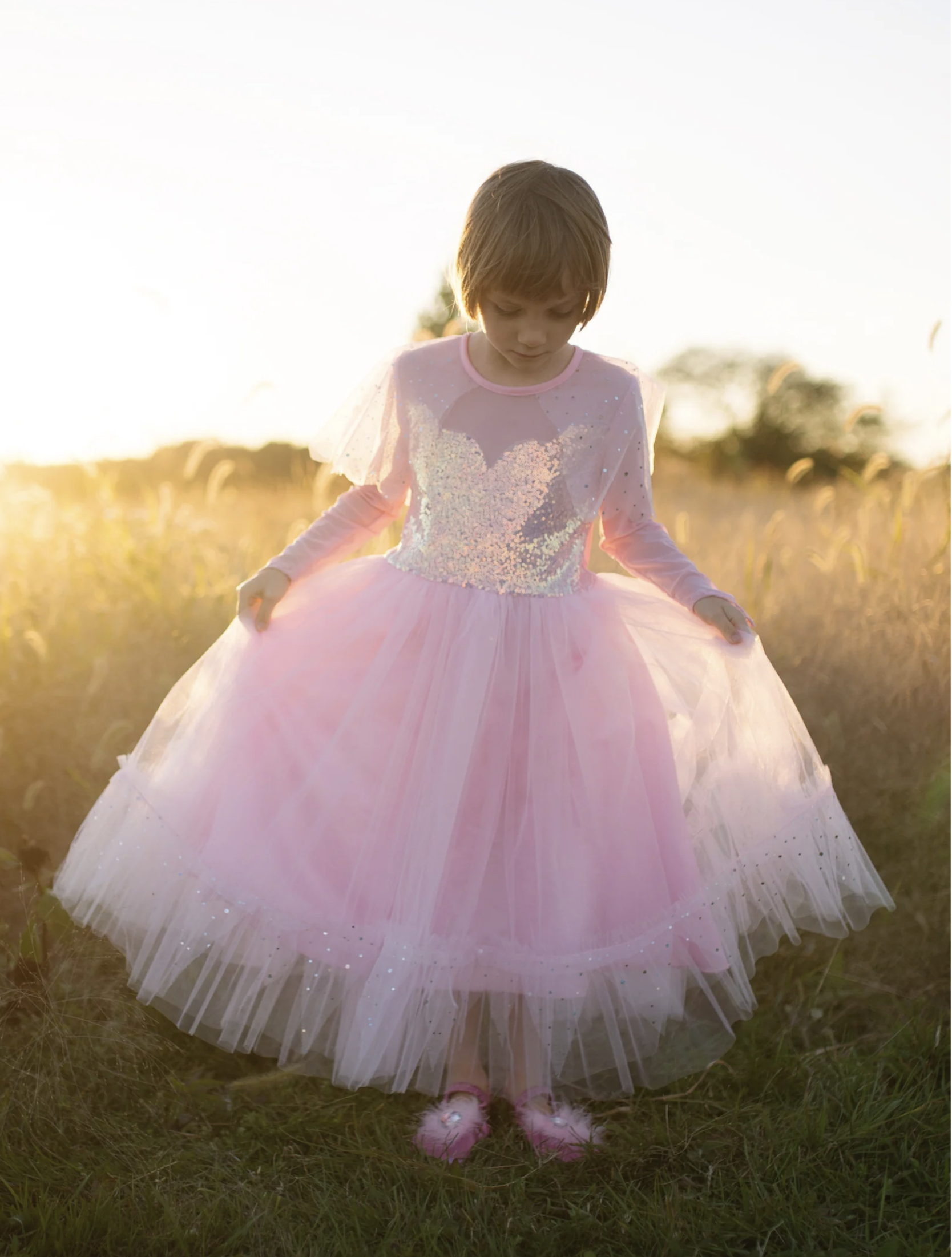 Con lentejuelas iridiscentes rosas y plateadas en el corpiño que se transforma en una hermosa falda rosa.