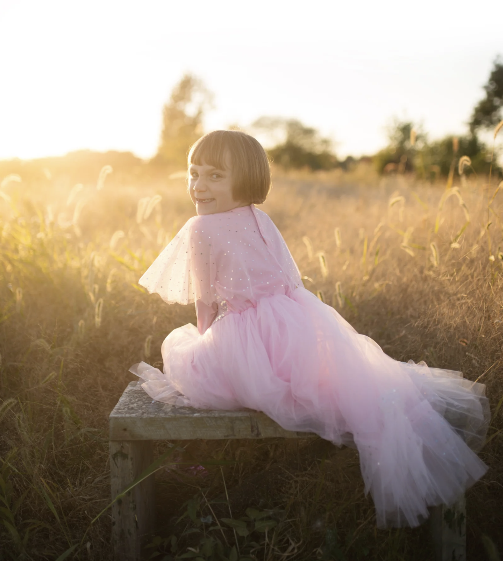 El encaje rosa cubre los hombros en la parte superior. Una falda amplia está forrada para mayor comodidad. Los informes están disponibles… ¡y es oficialmente imposible estar más guapa vestida de rosa!