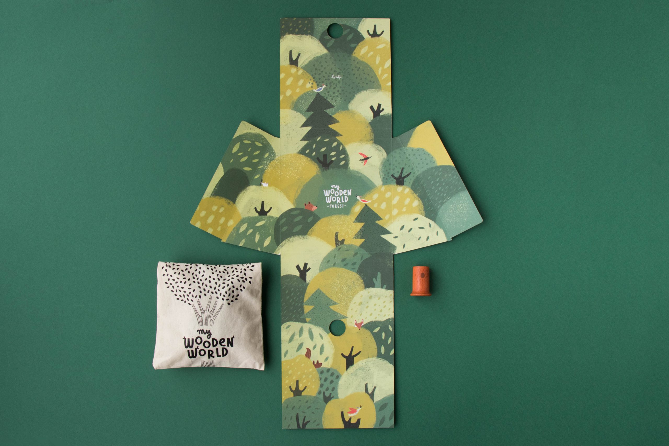 La madera es de haya, de origen local coloreada con tintes al agua. Podremos utilizar la caja de cartón como escenario para mil aventuras, además incluye una bolsa de algodón para guardar las piezas que nos facilitará poder jugar en cualquier lugar.